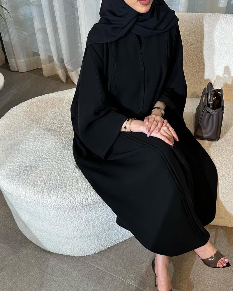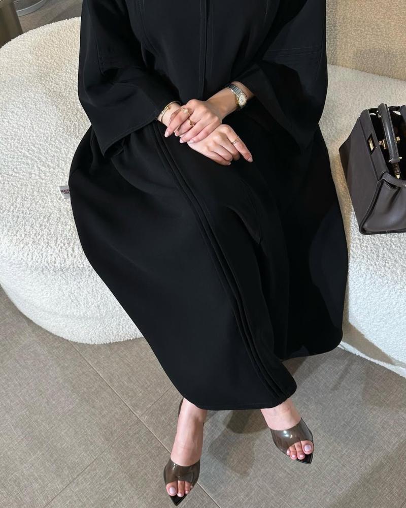 عباية ملكية فاخرة بقصة نص بشت، مصنوعة من قماش الكريب فيراري عالي الجودة. تتميز العباية بكسرات بالامام مع اليد، مما يضيف لمسة من الأناقة والتميز.