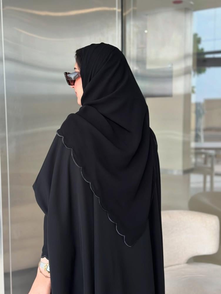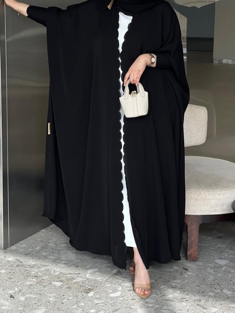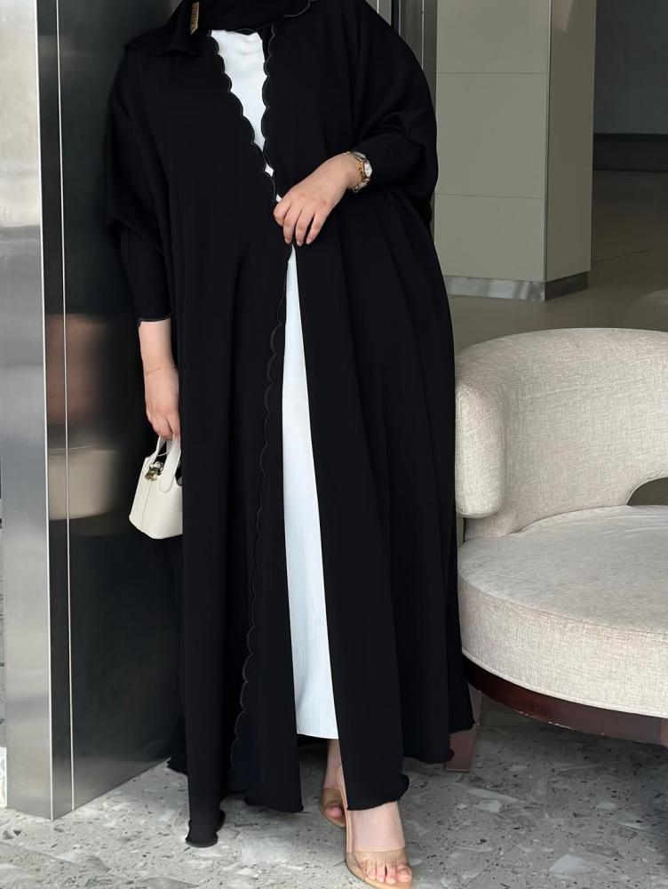 عباية فاخرة بقصة بشت كامل، مصنوعة من قماش الانترنت الملكي عالي الجودة. تتميز العباية بتطريز أنيق بالامام، مما يضيف لمسة من الفخامة والتميز.