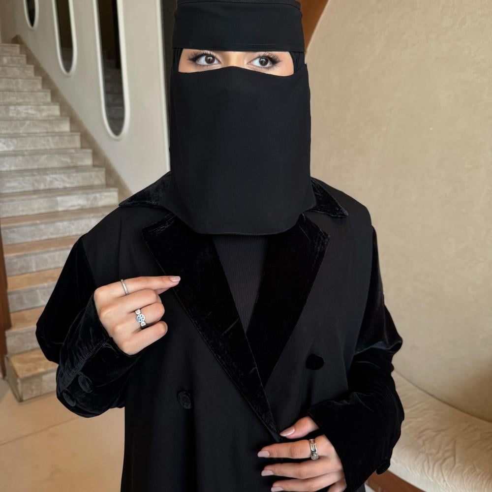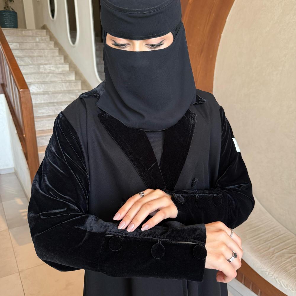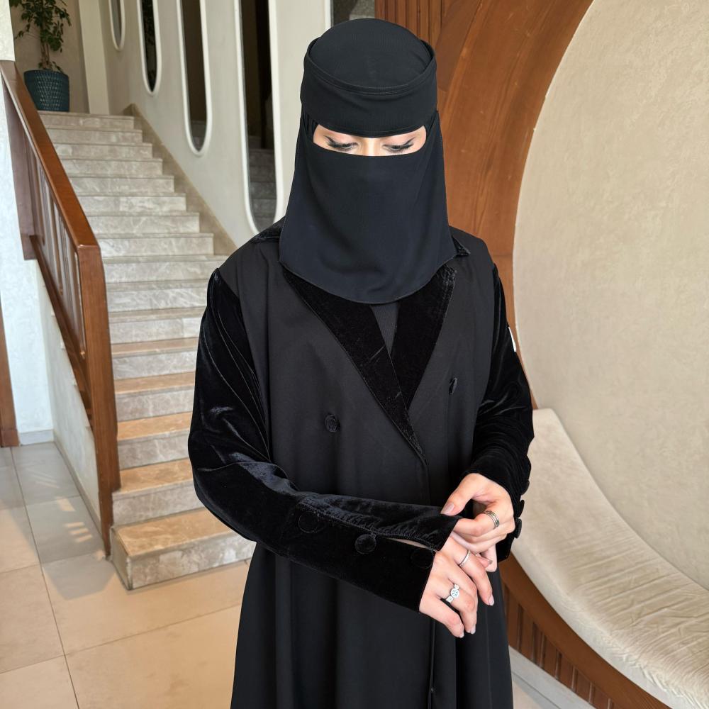 -عبايه عمليه شتويه منصوعه من قماش الواقف باكمام وياقه مخمل-قماش واقف +قطيفه-القصه نص كلوش-زرار من الامام